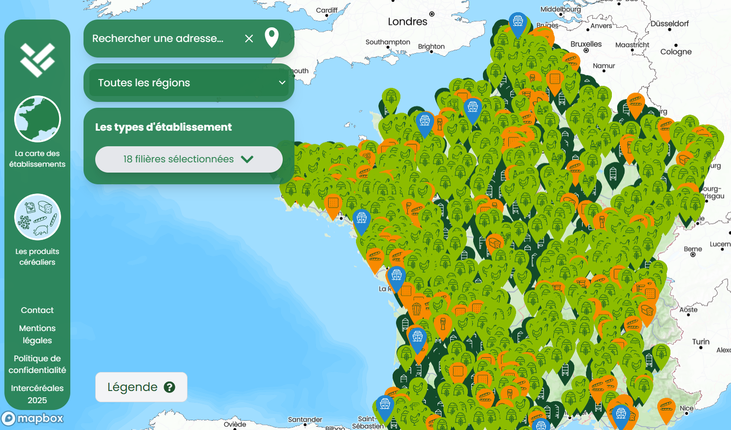 Cette carte interactive permet de filtrer et retrouver en quelques clics les types d'établissements de la filière céréalière par région. La fonction de géolocalisation a l'avantage d'identifier les structures autour de soi.